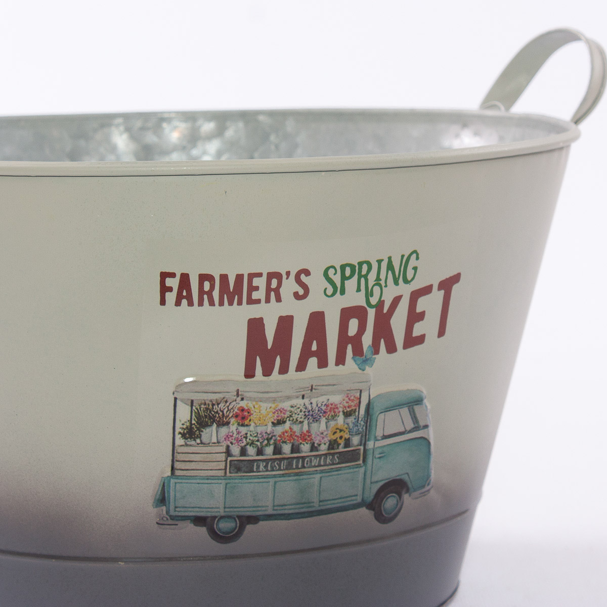 Capiente ciotola portavaso rotonda con due manici laterali, beige e grigio in latta con scritta Market e stampa camioncino con fiori colorati