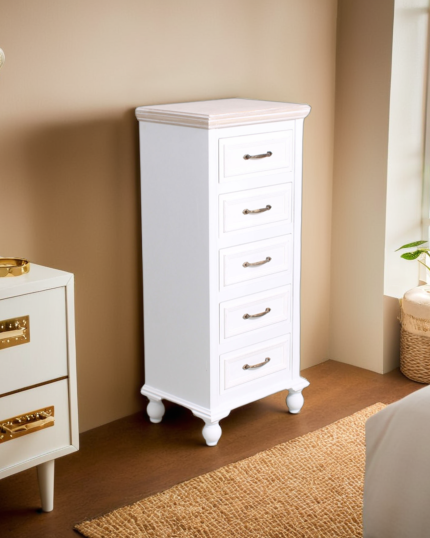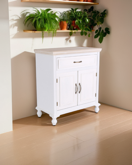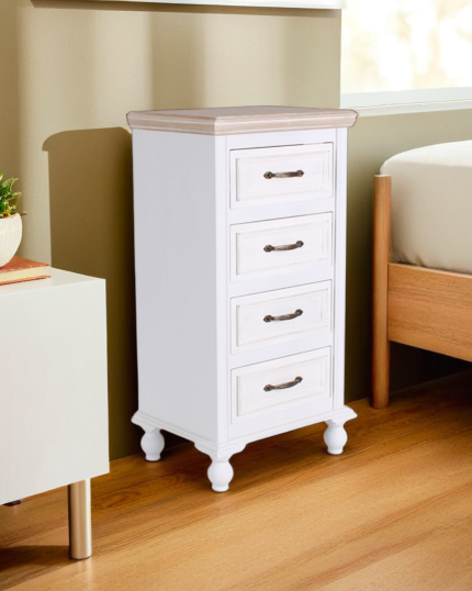 Il comodino “Sophia” DiKasa è l’aggiunta ideale per una camera da letto in stile classico o shabby chic. Realizzato in legno di pino con finitura bianca opaca, illumina l’ambiente con eleganza e sobrietà. I due cassetti offrono uno spazio pratico per riporre oggetti personali, mentre il top effetto legno naturale dona un raffinato contrasto visivo. Le maniglie in ferro dal design classico completano il look con un tocco di robustezza e stile senza tempo.