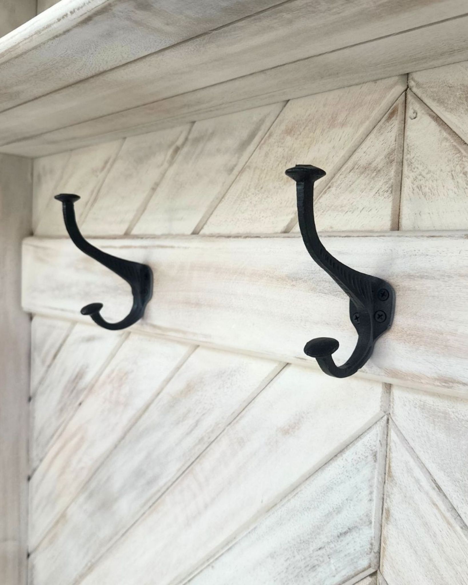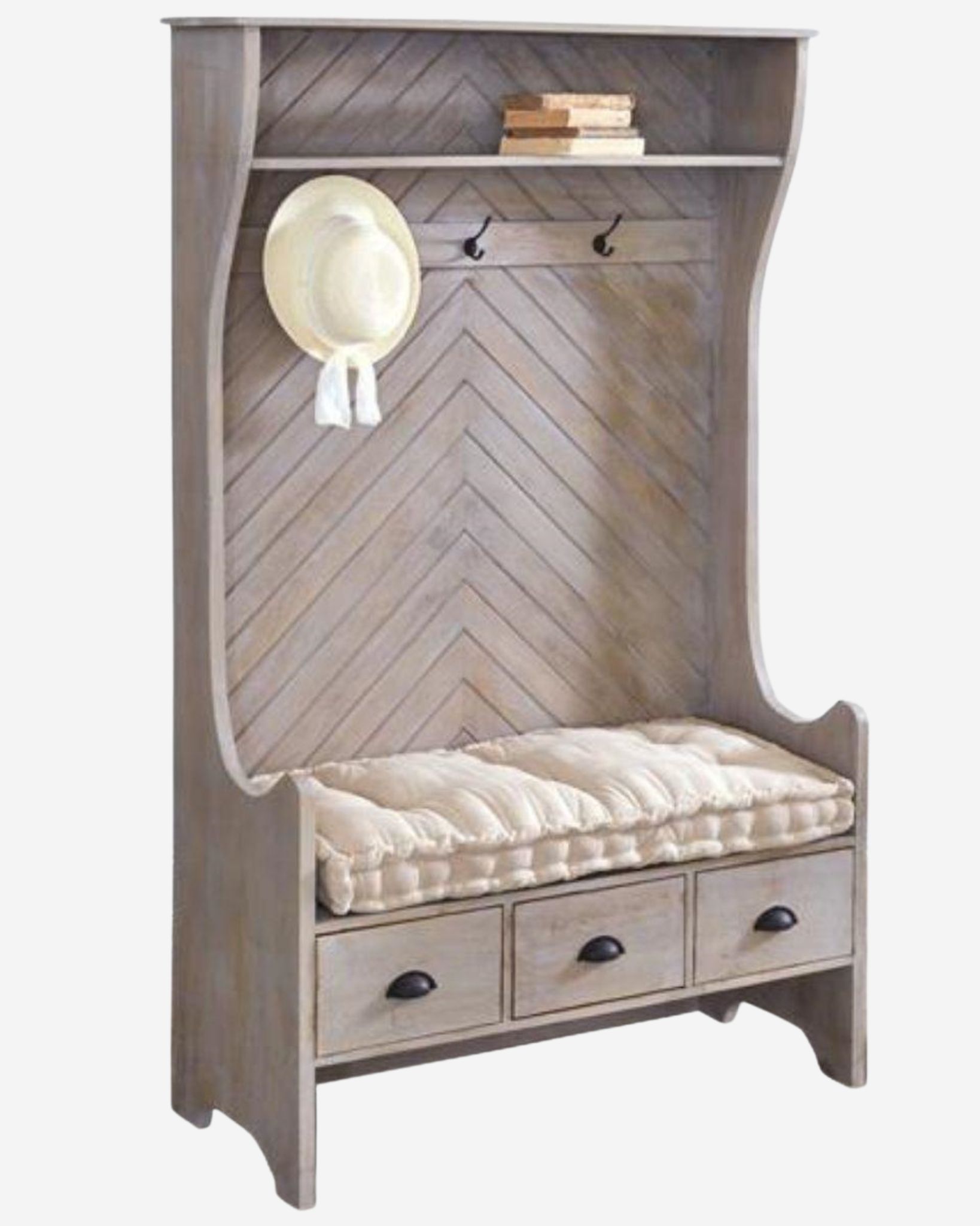 Dotato di robusti ganci in ferro, permette di appendere giacche, cappotti e sciarpe con praticità. I cassetti spaziosi offrono un comodo spazio per riporre guanti, berretti e altri accessori, mentre la panca con cuscini inclusi è perfetta per sedersi mentre ci si prepara per uscire.