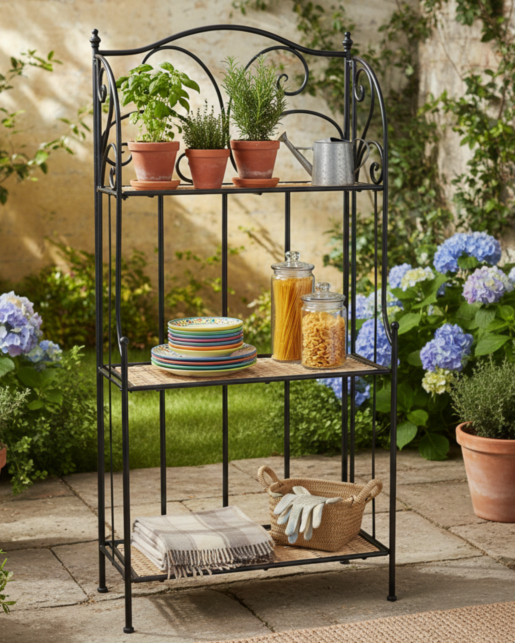 Scaffale in metallo e vimini a tre piani