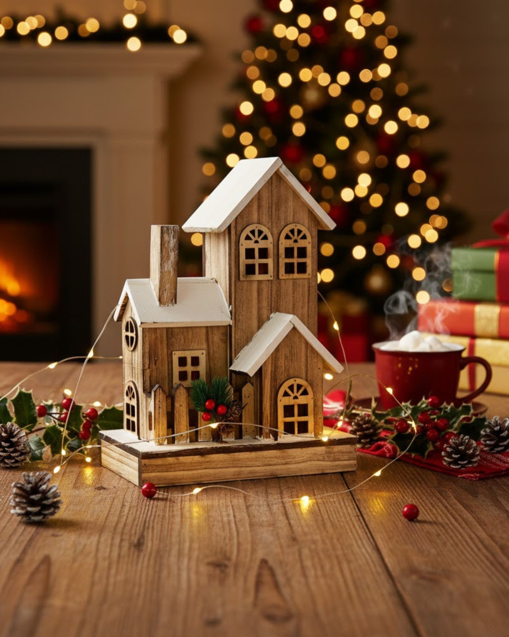 Porta un tocco magico nelle tue decorazioni con la Casetta Natalizia Decorativa realizzata in legno di abete. Dotata di illuminazione LED alimentata da 2 batterie AAA, diffonde una luce calda e accogliente, ideale per creare un’atmosfera festiva unica. Perfetta da posizionare su mensole, tavoli, ingressi o come parte di un villaggio natalizio. Grazie al suo design curato e naturale, dona charme e autenticità agli ambienti durante tutto il periodo delle feste.